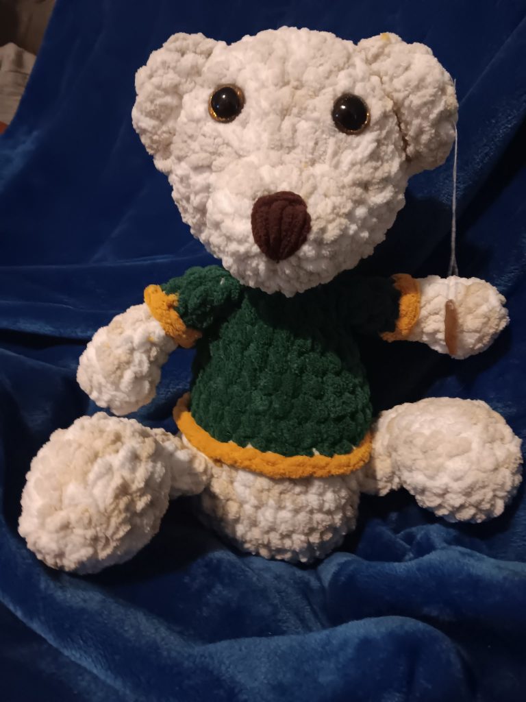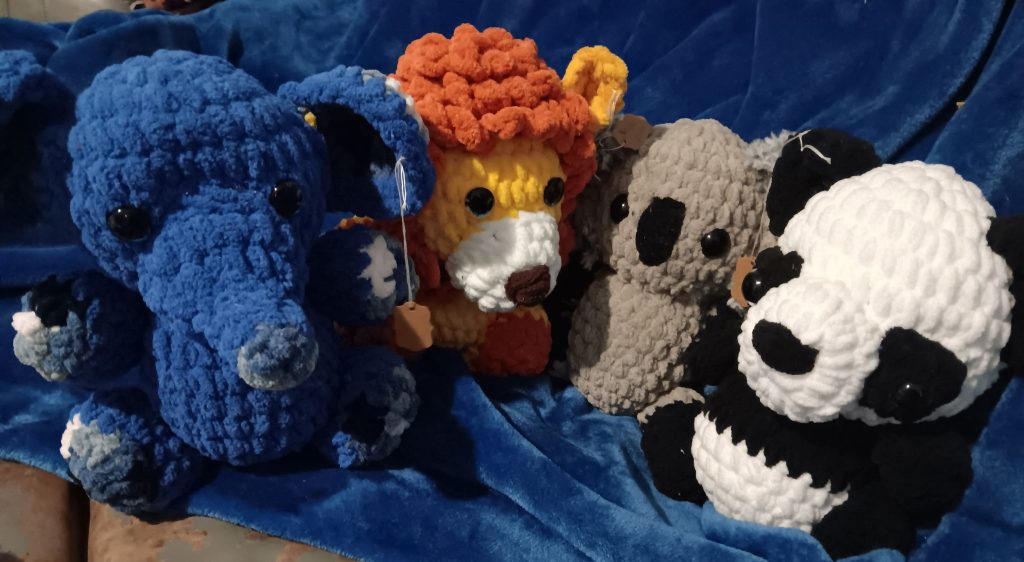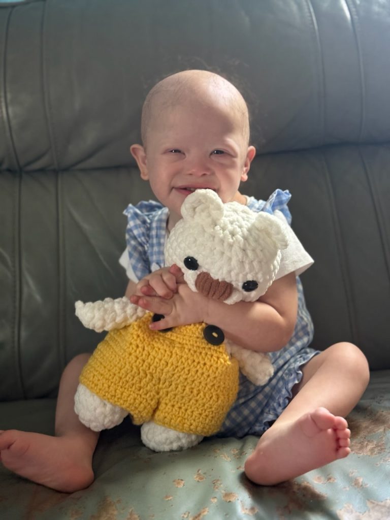 She makes stuffed crocheted plushies in colorful farm animals and pets in all different sizes- Sarah has adopted a down-syndrome baby girl- she named the Bella Bear after her daughter to bring awareness to Down Syndrome babies, “They are special children God brought into our lives.”